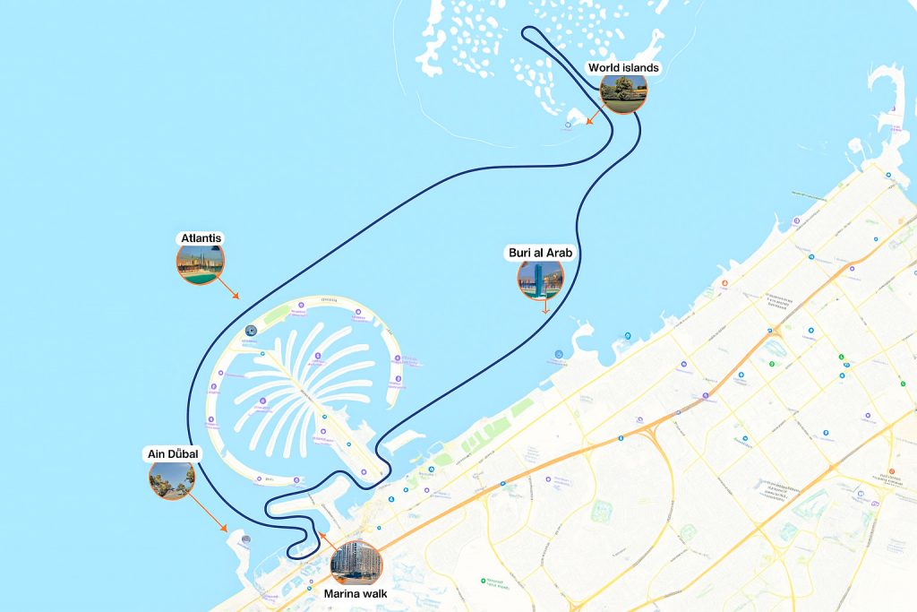 Тур к уникальному архипелагу у побережья Дубая, состоящему из нескольких сотен островков, расположенных в форме континентов. Красивые виды, меньше яхт по соседству. Для тех, кто хочет уединение, эксклюзив и «не просто яхту», а впечатляющий маршрут.